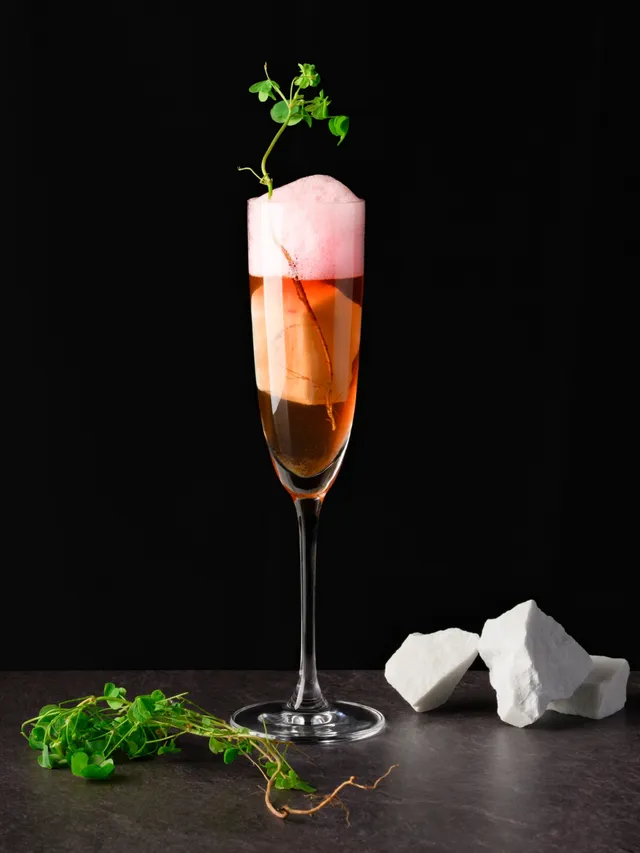 野菜くず由来のスープとグラッパに、自身の彫刻作品の破片と雑草を入れて楽しむという、既成概念を揺さぶるホットカクテルだ。