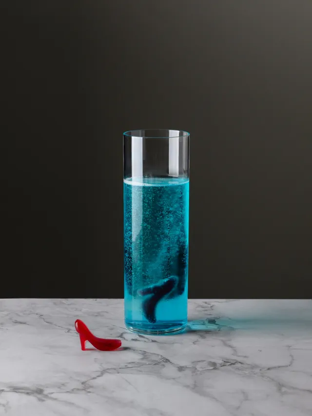 やなぎみわ氏は、代表作《エレベーターガール》を思わせるハイヒール型のゼリーを浮かべた『elevator girls』で、作品の艶やかな世界観を表現する。