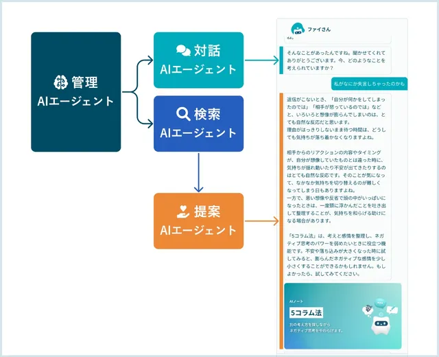 まず「対話AI」がユーザーとの会話を担当。その内容を「管理AI」が常に監視し、心理士が設計したルールに基づいて提案のタイミングを判断する。提案が必要と判断されると、「検索AI」が対話内容を要約し、RAG(検索拡張生成)と呼ばれる技術を用いて、独自の心理ソリューションデータベースから最適な候補を検索。最後に「提案AI」が、検索結果をもとに自然なレコメンド文を生成し、会話を途切れさせずにユーザーへ届ける仕組みだ。