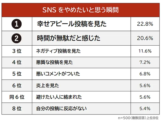 調査によると、「SNSをやめたいと思う瞬間」として最も多くの人が挙げたのは「幸せアピール投稿を見たとき」で、全体の22.8%を占めた。