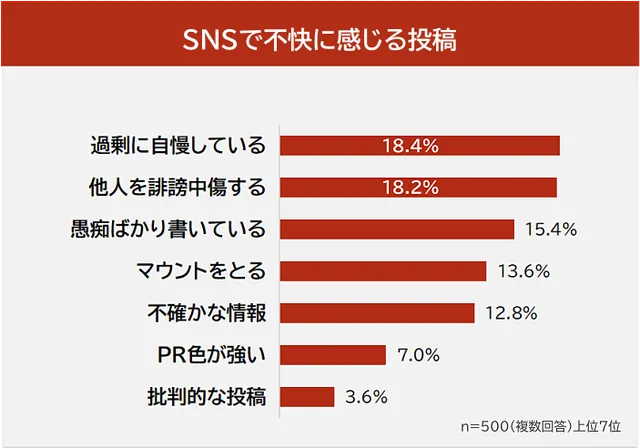 特に1位の「幸せアピール」については、「自分が落ち込んでいるときに『お金持ちアピール』などを見ると精神的にやられてしまう」といった声が寄せられており、他者の華やかな投稿が自身の状況との比較を促し、劣等感や嫉妬心につながる構図がうかがえる。
