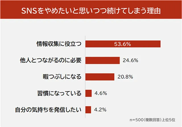 次いで多かったのは「他人とつながるのに必要」(24.6%)という理由だ。友人関係の維持や、同じ趣味を持つ人々との交流の場としてSNSが機能しており、人間関係を断ちたくないという思いが利用の継続につながっている。