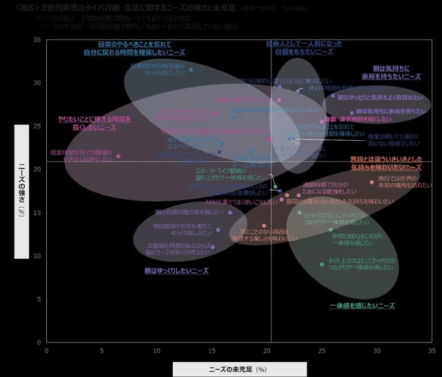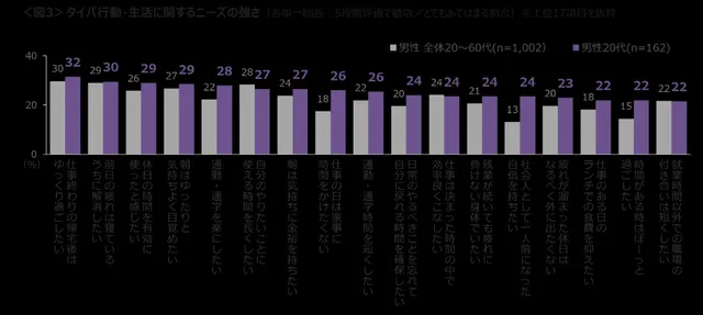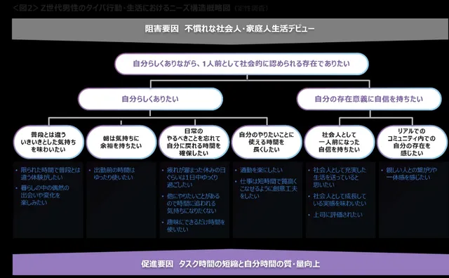 また、男性全体と比較してZ世代が特に強いニーズとして、「社会人として一人前になった自信を持ちたい」「通勤時間で自分のためになる勉強をしたい」「仕事の日は家事に時間をかけたくない」といった項目が挙げられている。