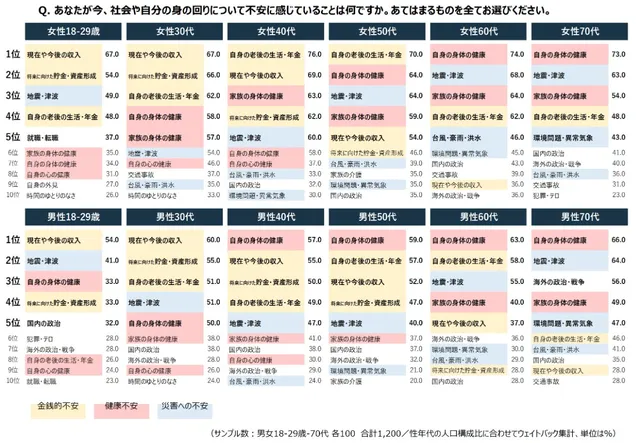 60代女性を除く全ての年代で「経済面」に関する不安が1位となり、昨年度の調査で男性40〜60代のトップだった「自身の身体の健康」を上回った。