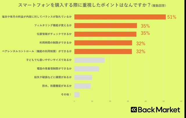 スマホを選ぶ際に重視する点として最も多かったのは「端末価格や月額料金が内容に見合っているかどうか」(51%)という回答だった。次いで「フィルタリング機能」や「位置情報の確認」といった安全面の機能が上位を占める。
