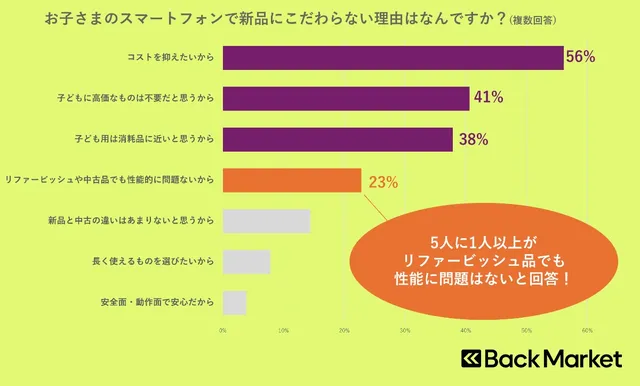 子どものスマホ購入にあたり、約32%の保護者が「新品にこだわらない」と回答している点も興味深い。その背景には、やはりコスト意識がある。「コストを抑えたい」が理由の半数を占め、「子どもに高価なものは不要」「子ども用は消耗品に近い」といった割り切った考え方も多く見られた。
