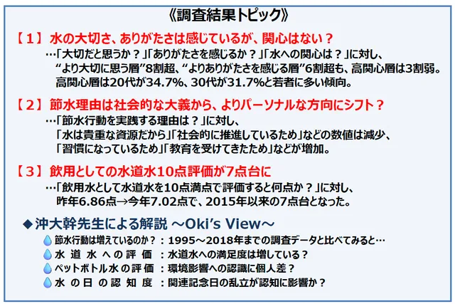 今回の結果からは、節水が習慣として根付きつつある一方で、特定のテーマへの関心が薄れるなど、水に対する現代人の複雑な意識がうかがえる。