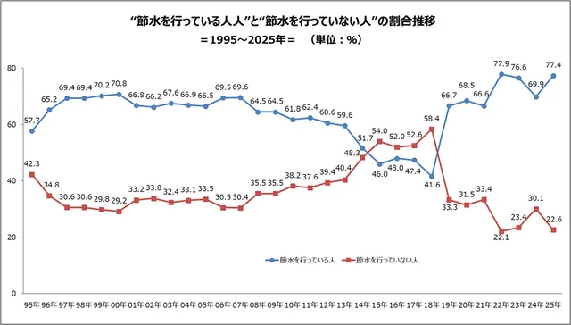 同センターのプレスリリースによれば、この背景には設問形式による影響も考えられるものの、節水行動そのものは広がりを見せている模様。