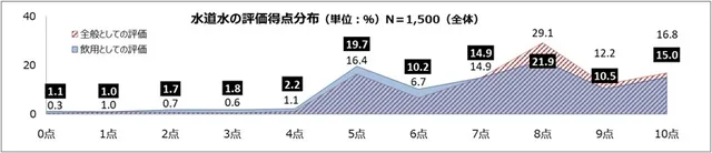 水道水に対する評価は向上傾向にあり、全般的な評価は10点満点で平均7.47点、飲用としての評価も7.02点と、昨年の数値を上回った。しかし、飲用としての評価は全般評価に比べて依然として厳しい見方がされているという。
