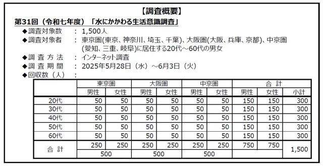 1995年から続くこの定点調査は、東京圏、大阪圏、中京圏の住民を対象に、水と生活の関わりや意識の変遷を追うもの。