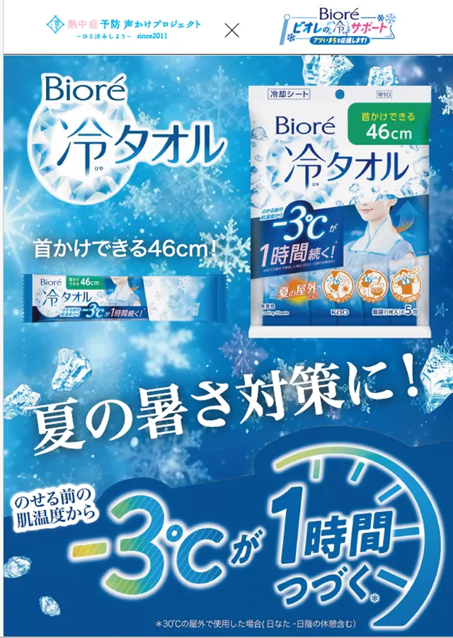 具体的には、肌にのせる前の肌温度からマイナス3℃の状態が1時間続くという『ビオレ 冷タオル』の個装販売を実施。