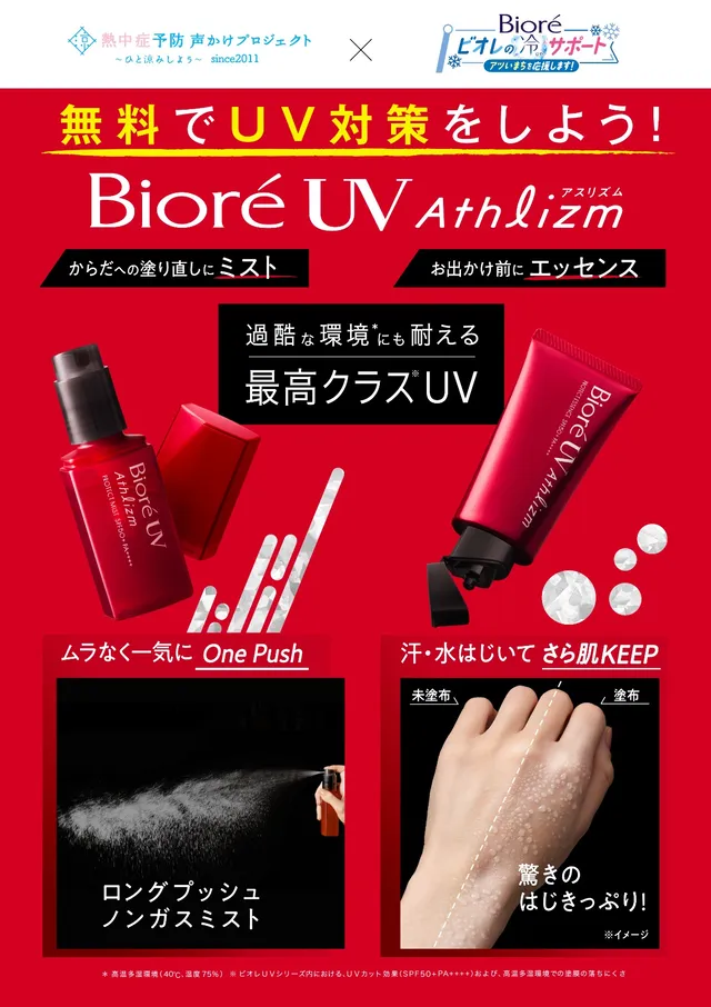 さらに、高温多湿といった過酷な環境にも耐えるビオレUVシリーズ最高クラスの日やけ止め『ビオレUV アスリズム』の無料試用体験コーナーが設置されるとのこと。これにより、来訪者が「暑い」と感じたその場で対策を講じられる環境の提供を目指す。