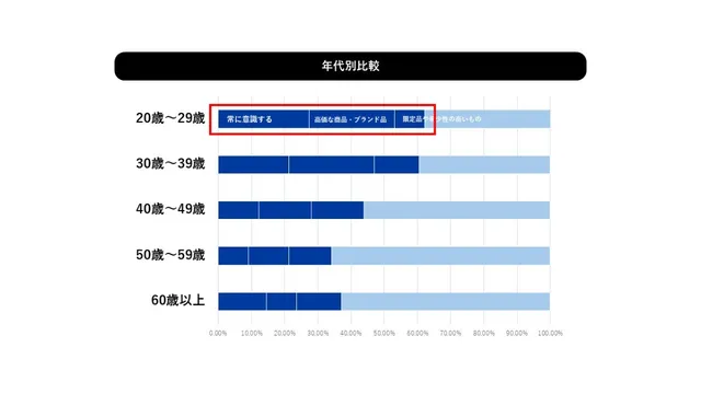 30代以上が「価格の安さ」や「節約」といったコストパフォーマンスを重視する傾向にあるのに対し、Z世代は「自分らしさを表現できる」「他人と被らない」「環境にやさしい」といった項目で全世代平均を大きく上回ったとのこと。