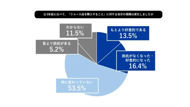 また、5年前と比較してリユース品の購入にポジティブな意識を持つようになった人は、全体の約6割にのぼるという。