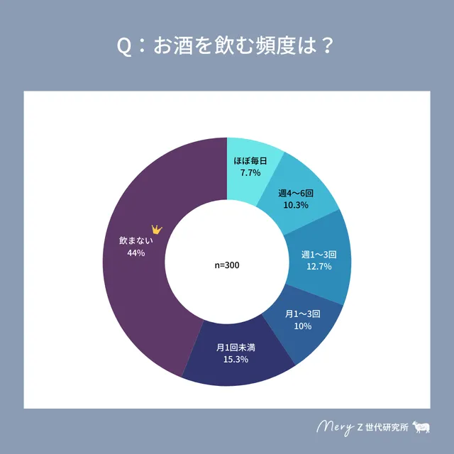 2025年7月に全国の20歳から29歳の男女300名を対象に行われたこの調査によると、「お酒を飲む頻度」について尋ねたところ、「飲まない」と回答した人は44%だった。残りの56%は何らかの形でお酒を飲む習慣があることがわかった。