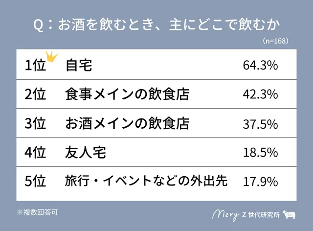 お酒を飲むZ世代は56%、飲む場所は「自宅」が最多