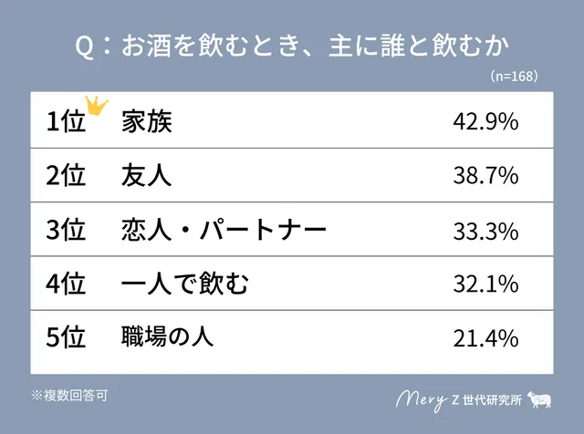お酒を飲む習慣がある人に「主にどこで飲むか」を尋ねた質問では、「自宅」が64.3%で最も多く、「主に誰と飲むか」という問いに対しては、「家族」が42.9%でトップという結果に。