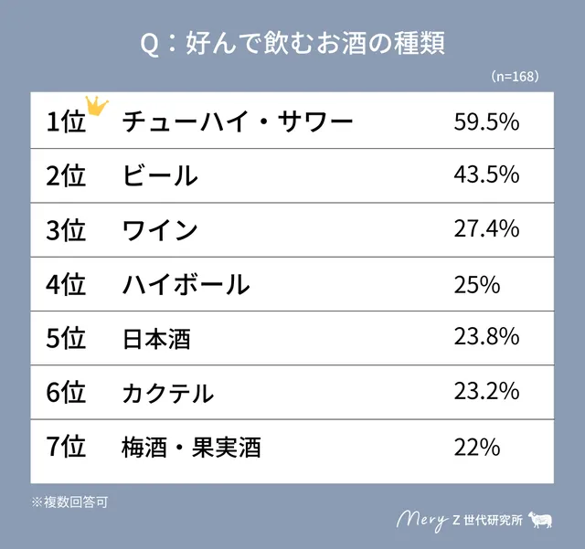 また、好んで飲むお酒の種類としては、「チューハイ・サワー」が59.5%で最も多く、「ビール」(43.5%)を上回った。