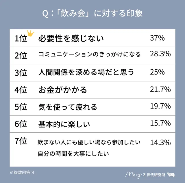 また、「飲み会」に対する印象についても、「必要性を感じない」が37%で最も多かった一方で、「コミュニケーションのきっかけになる」(28.3%)、「人間関係を深める場だと思う」(25%)といった肯定的な回答も続いた。