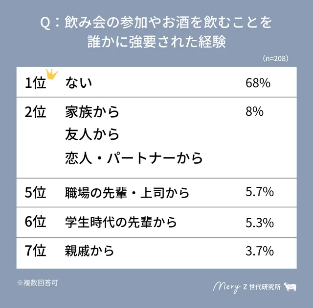 「飲み会の参加やお酒を飲むことを誰かに強要されたことがあるか」という質問では、約7割が「ない」と回答。