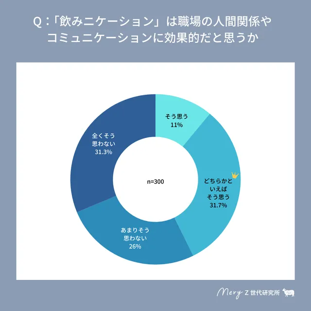 職場の人間関係における「飲みニケーション」の効果については、意見が分かれる結果となった。「(効果が)どちらかといえばそう思う」が31.7%だったのに対し、「全くそうは思わない」も31.3%とほぼ同率だった。