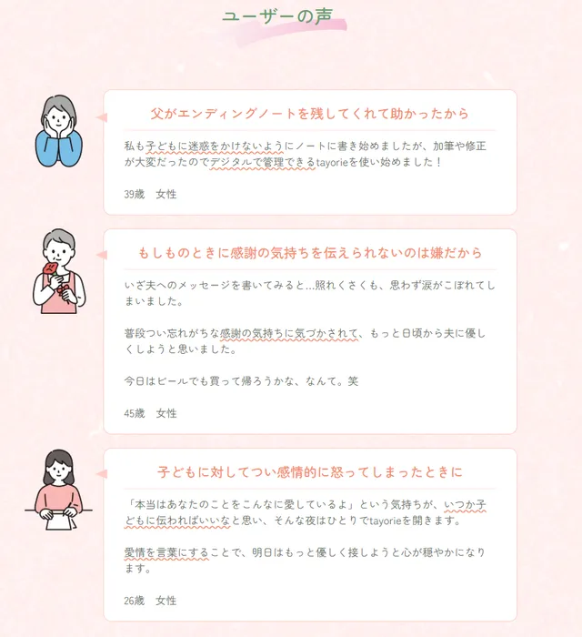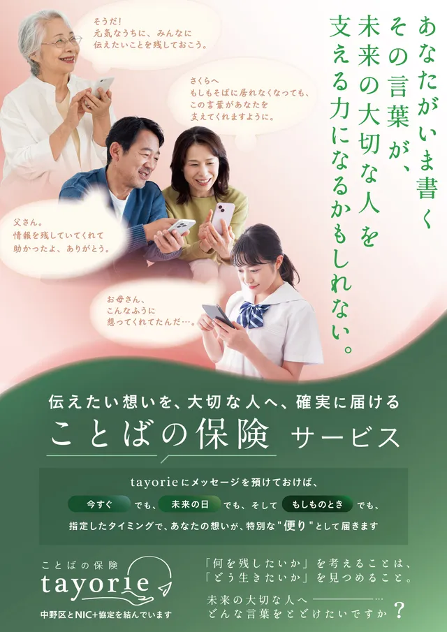 「tayorie」は、万が一の際に備え、大切な人へメッセージや情報を自動で届けるWebサービス。