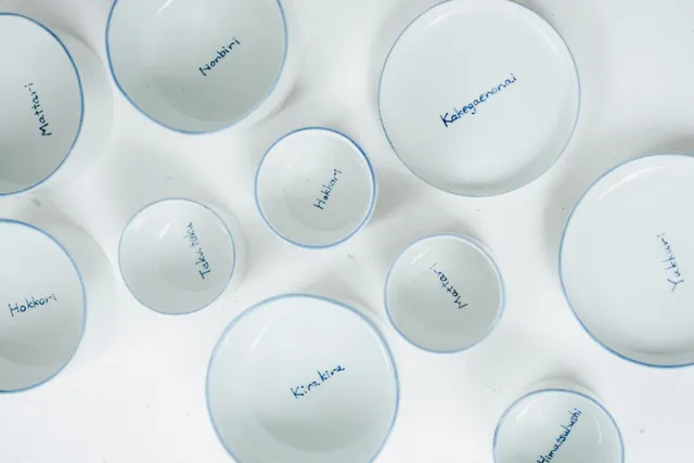 製品は、ジュエリートレイ、お猪口、抹茶ボウルの3種類。江戸時代から石川県で採掘され続けている希少な「花坂陶石」の粘土を使用し、早朝の海を思わせる淡いアイスブルーの色合いが特徴。器の底には、心をほどく日本語の言葉が一つひとつ刻まれている。