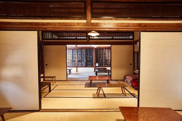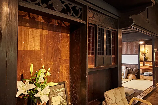 京都の茶屋建築のような細かな格子窓のエントランスや大きな古材の大黒柱、現在では製造されていない波板ガラスの明り取りなどは建築古材を使ってリノベーションしたもので、建物の雰囲気とよく馴染んでいます。