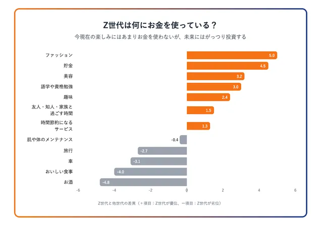 Z世代は、旅行や車、美味しい食事やお酒といった「今を楽しむ消費」よりも、貯金や美容、語学や資格勉強、時間を節約するサービスなど「未来の自分のための出費」を優先する傾向にあるそう。