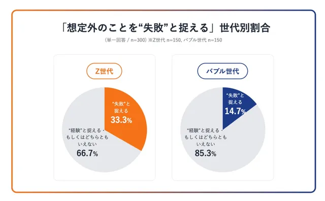 2025年8月、株式会社メルカリの調査機関「サーキュラーエコノミー総研」が発表したデータによれば、Z世代(18〜26歳)の約3人に1人(33.3%)が「想定外の出来事を失敗と感じる」と答えています。いっぽう、バブル世代(43〜51歳)では14.7%。世代間で2倍以上の差があるという結果に。