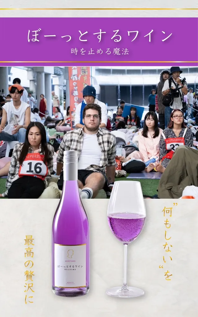 『ぼーっとするワイン - 時を止める魔法 -』は白ワイン(甘口・紫)で、アルコール度数は6.5%。天然バタフライピーによる幻想的な紫色と、マスカット由来の優しい甘口仕立てが特徴だ。美しい外観と「静けさの味わい」を両立しているという。