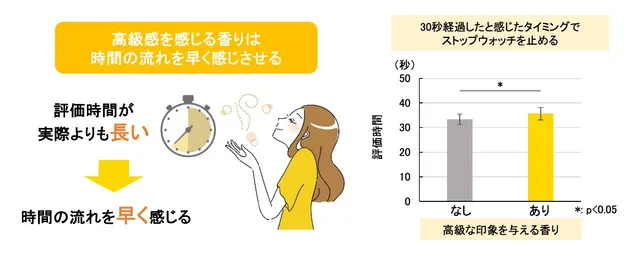 このことから、高級感のある香りは脳に作用し、時間の感覚を忘れさせることで、時間の流れを早く感じさせている可能性があると推測している。