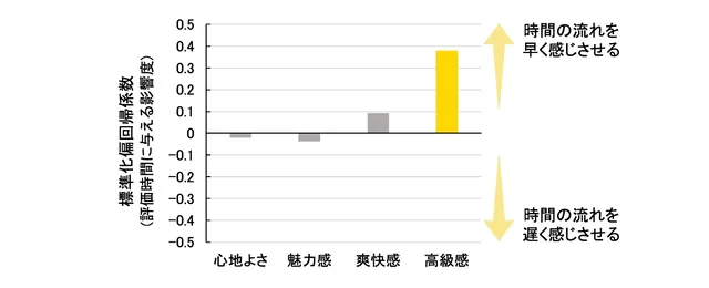 被験者が30秒経過したと感じたタイミングでストップウォッチを止めてもらう方法で、時間の感じ方を測定したとのこと。その結果、「高級感」が主観的な時間を長く感じさせる、つまり時間の流れを早く感じさせる最も強い要因であることが判明したという。