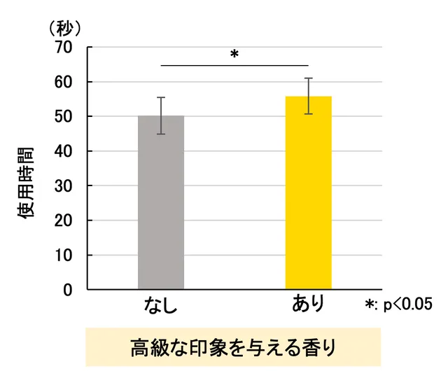 女性14名を対象に、高級な印象を与える香りをつけた化粧水と、香りをつけていない化粧水をそれぞれ使用してもらい、その使用時間を比較したようだ。