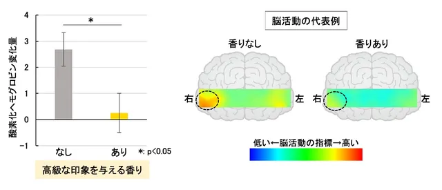 さらに、高級感のある香りを嗅いでいる間の脳活動をfNIRS装置で計測したところ、時間の感覚に関与する右前頭前野の活動が抑制されることが明らかになった。