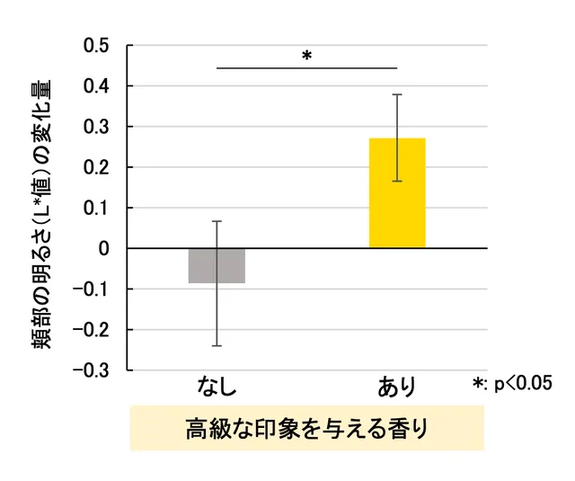 さらに、化粧水使用前後の肌の明るさを測定したところ、高級感のある香りをつけた化粧水を使用した方が、使用後の肌がより明るくなるという結果が得られた。