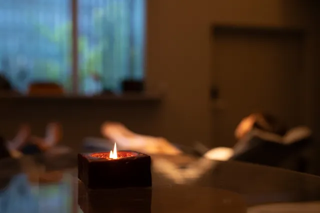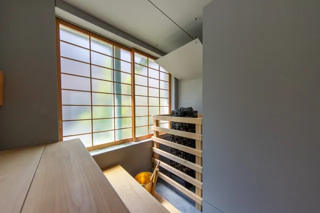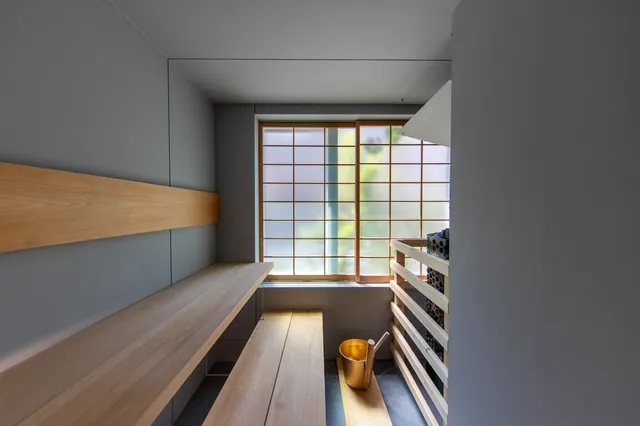 サウナ室のベンチには奈良・吉野産のヒノキが用いられ、木の香りと静寂に包まれた瞑想のための空間が用意されているという。