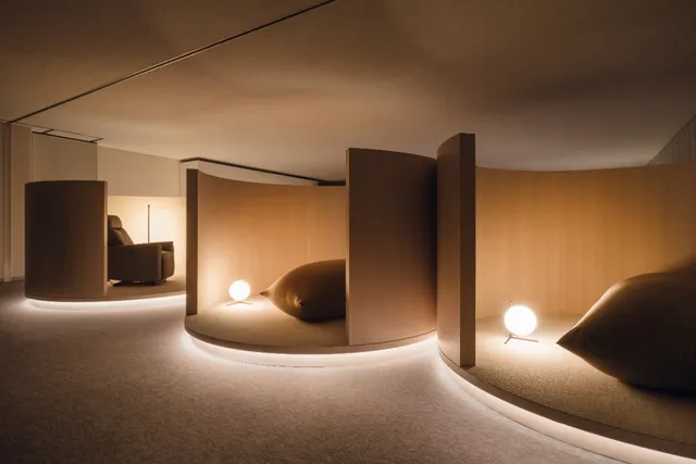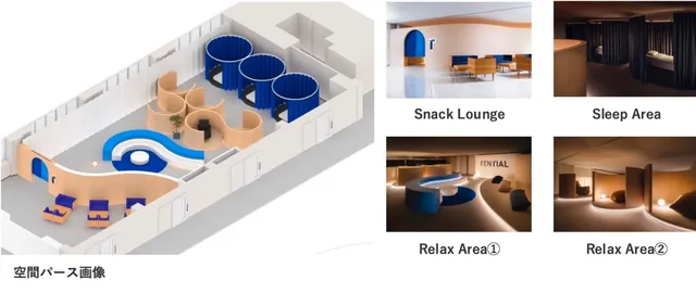 仮眠、瞑想、ストレッチといった各ゾーンが一体感を持ちつつもシームレスに繋がり、プライバシーも保たれる空間構成が特徴。