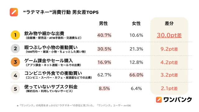次いで「暇つぶしや小物の衝動買い(100円均一・雑貨など)」が男性30.5%、女性21.3%、「ゲーム課金やセール購入」が男性16.9%、女性12.8%と続き、いずれも男性の方が高い割合を示した。