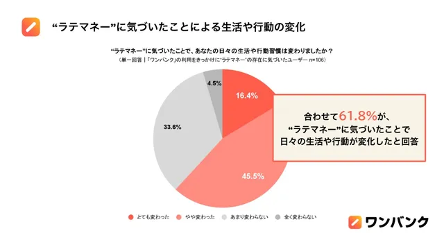 自身のラテマネーに気づいたユーザーのうち、61.8%が「日々の生活や行動習慣が変化した(とても変わった・やや変わった)」と回答。