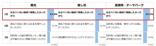 特に「推し活」目的の利用者ではその割合が76.7%と最も高く、「旅先で自由に使えるお金を増やしたかった」「宿泊費を浮かせることができる」といった理由も上位に。