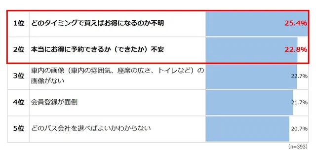 一方で、利用者の悩みとしては、「どのタイミングで買えばお得になるのか不明」「本当にお得に予約できたか不安」といった価格に関する不安が上位を占める結果となった。