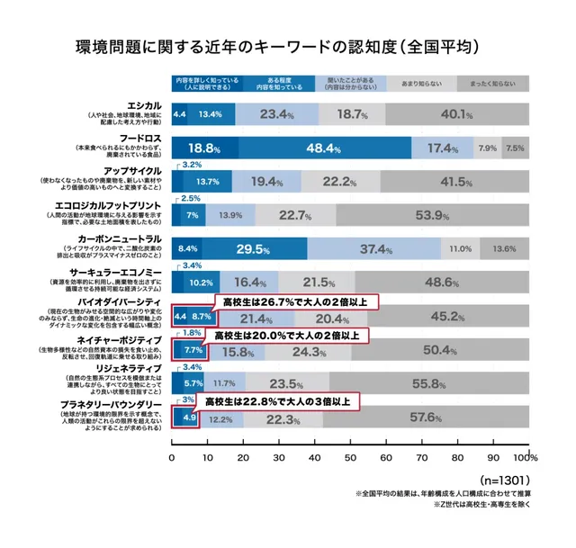 「バイオダイバーシティ」「ネイチャーポジティブ」「プラネタリーバウンダリー」といった専門性の高いワードにおいて、高校生世代の認知度は大人世代の3倍以上に達する項目もあった。