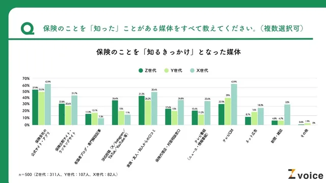 X世代とY世代では「テレビCM」が2番目に多かったのに対し、Z世代では4位にとどまり、認知経路に世代間の違いが見られた。