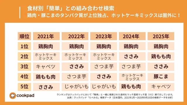「簡単×食材」の組み合わせ検索では、「鶏胸肉」が5年連続で1位を維持。