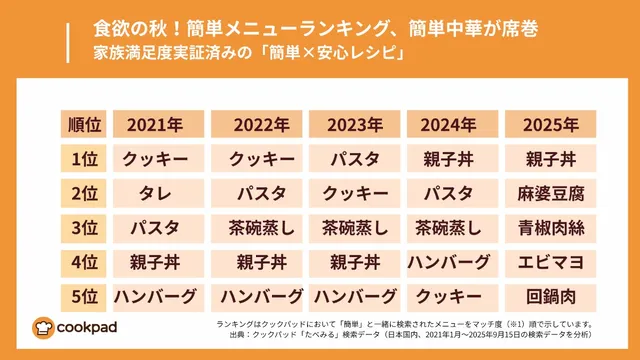 食欲の秋。クックパッドが“簡単メニューランキング”を発表。簡単中華が上位を席巻