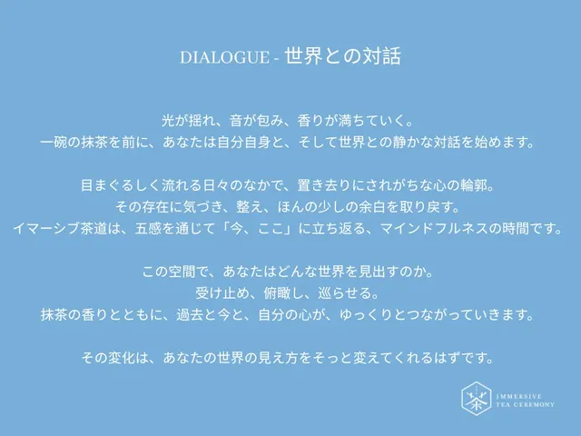 この『イマーシブ茶道』は、単に抹茶を味わうだけでなく、映像・音・香り・味・手触りといった五感のすべてで茶道の精神を体感することを目指している。