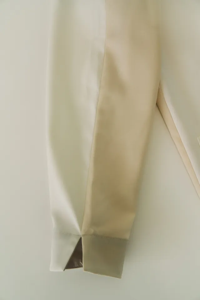 真っ白な生地に淡いベージュを重ねることで、清潔感に凛とした気配を与え、纏う人の