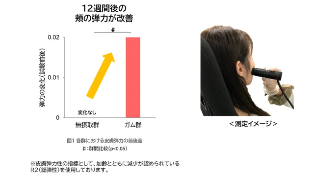 その結果、皮膚粘弾性測定装置による測定で、ガムを摂取した群の右頬の皮膚弾力性が、摂取しなかった群と比較して有意に増加したとのこと。