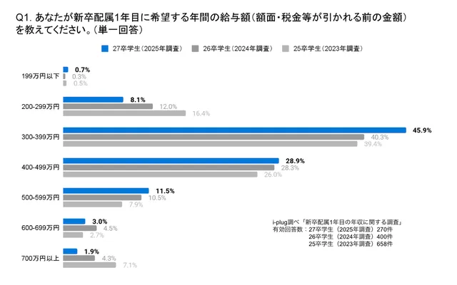 27卒学生に新卒1年目に希望する年収を尋ねたところ、「300〜399万円」が45.9%で最多だった。